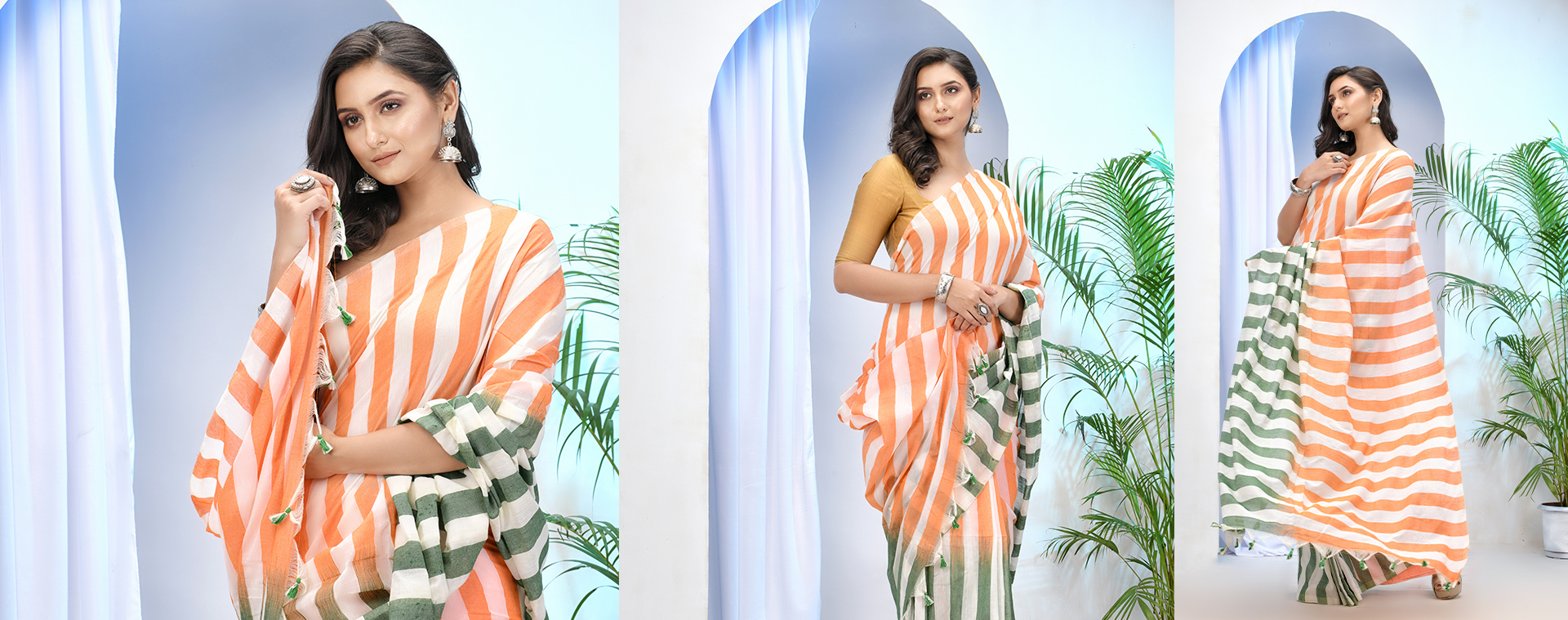 Women`s Pure Malmal Cotton and Bengal Soft Khadi Mul Mul Handloom Cotton Saree in Tricolour (Orange White Green)