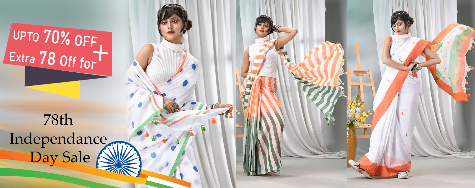 dB DESH BIDESH Women's Tri Color Pure Handloom Cotton Saree With Blouse Piece (Independance Day Saree Orange White Green)